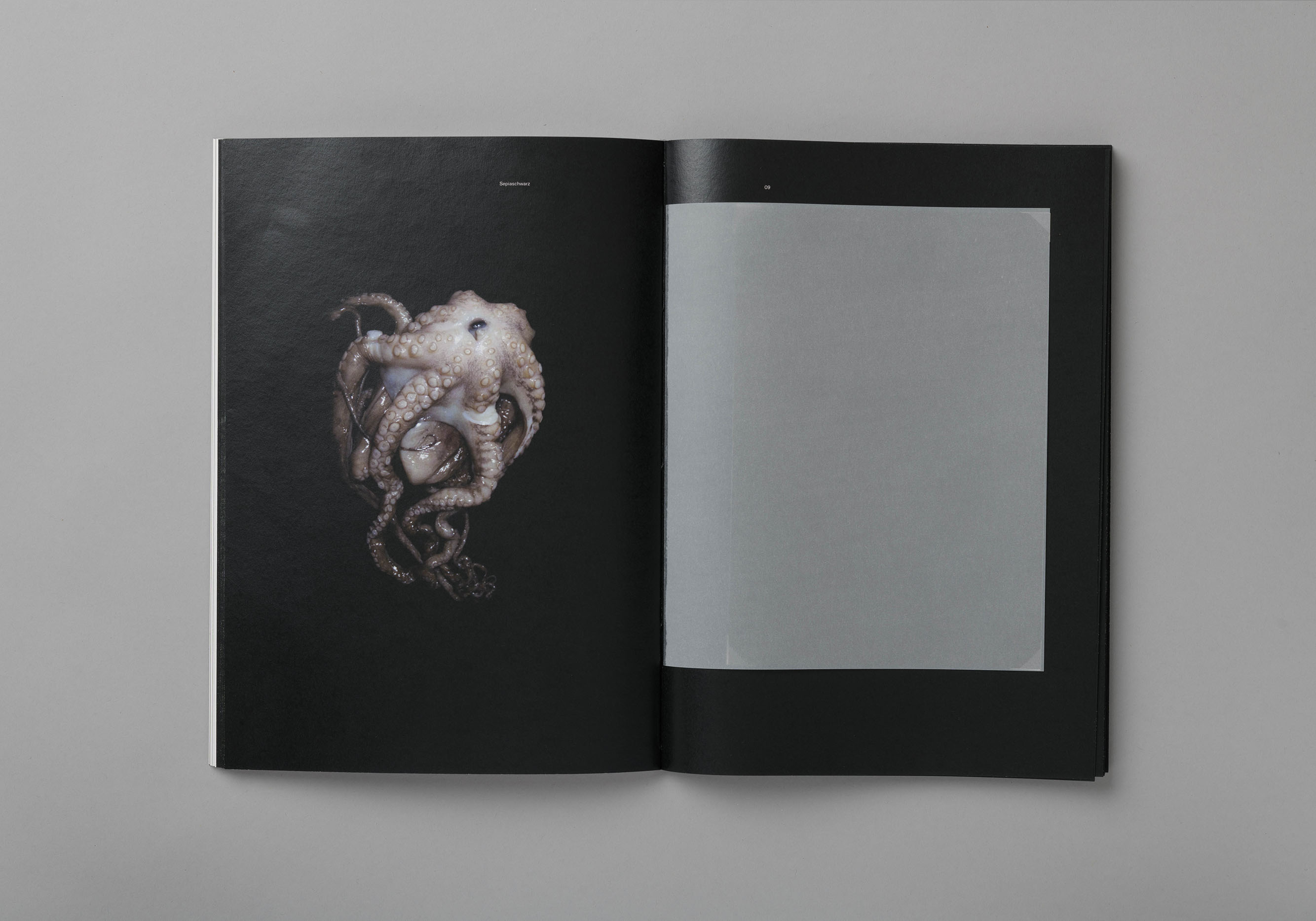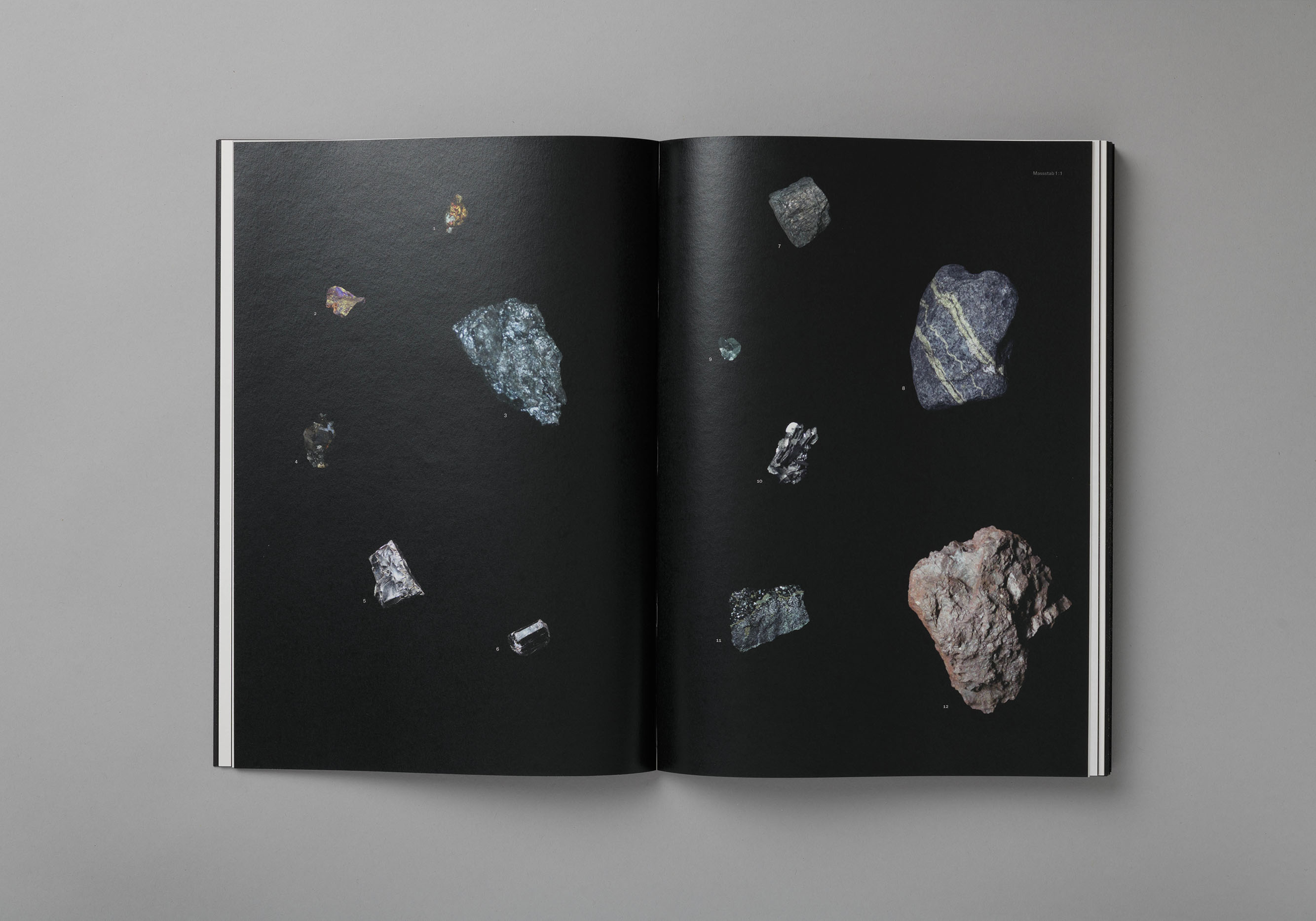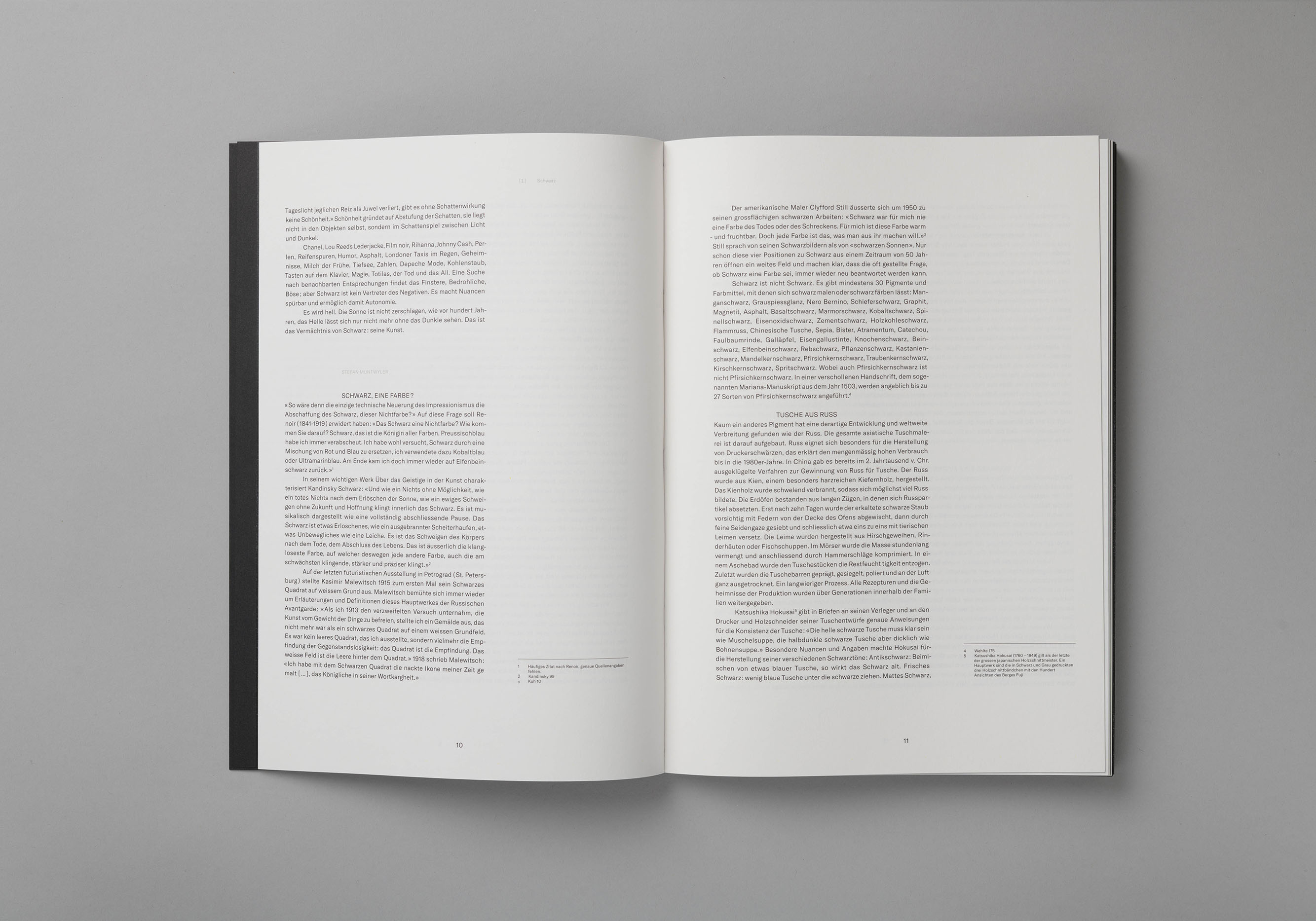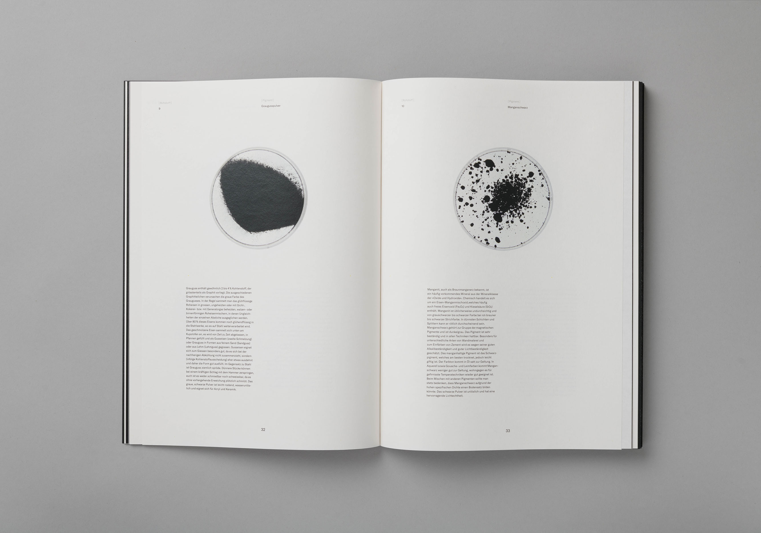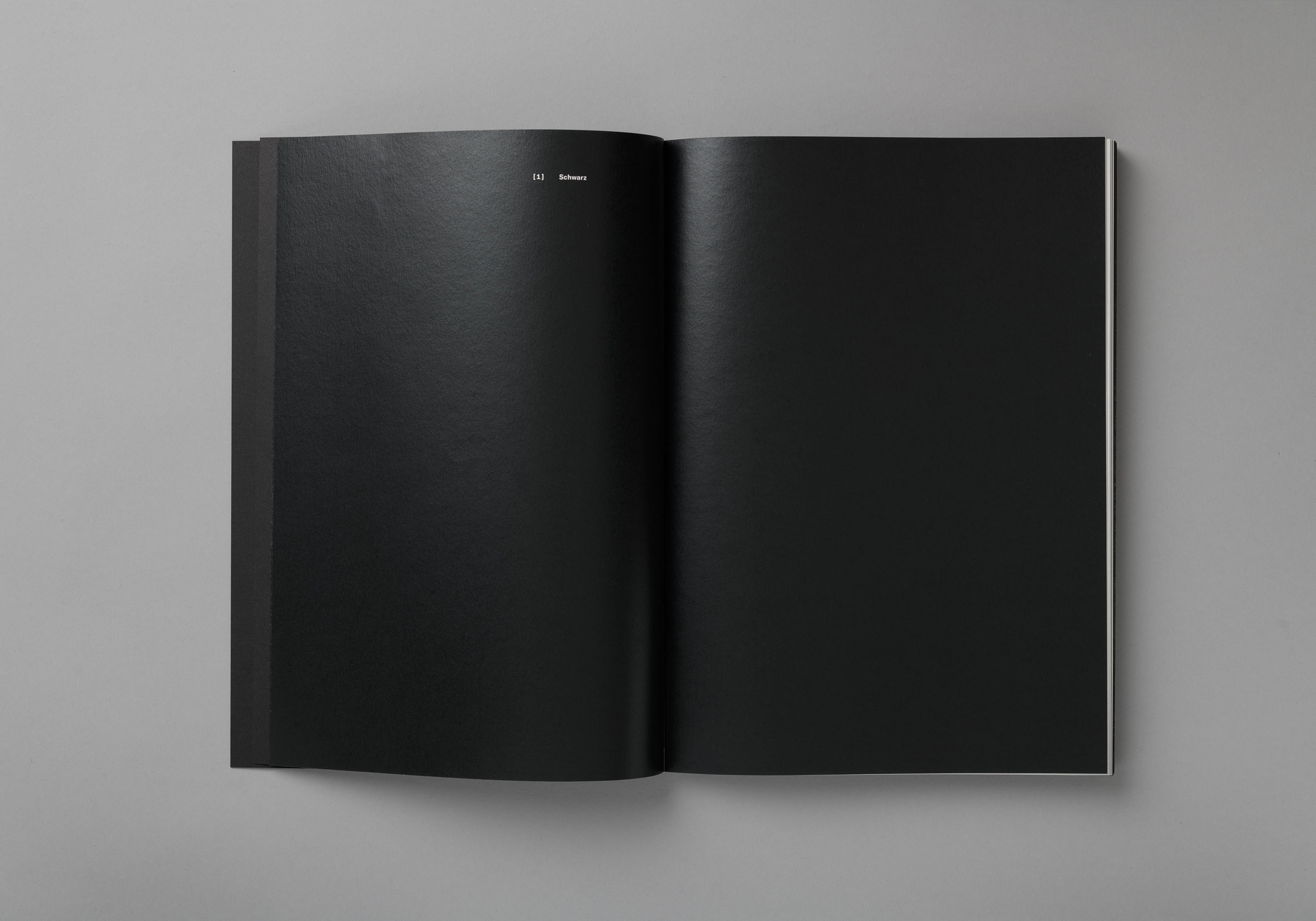 Farbuntersuchung zur Farbe Schwarz. Die Publikation zeigt den Prozess vom Ursprungsmaterial zur Verarbeitung der Pigmente, welche zu Farbe angerührt wurden. Die unterschiedlichen Farbnuancen sind in Form von Siebdrucken integriert.